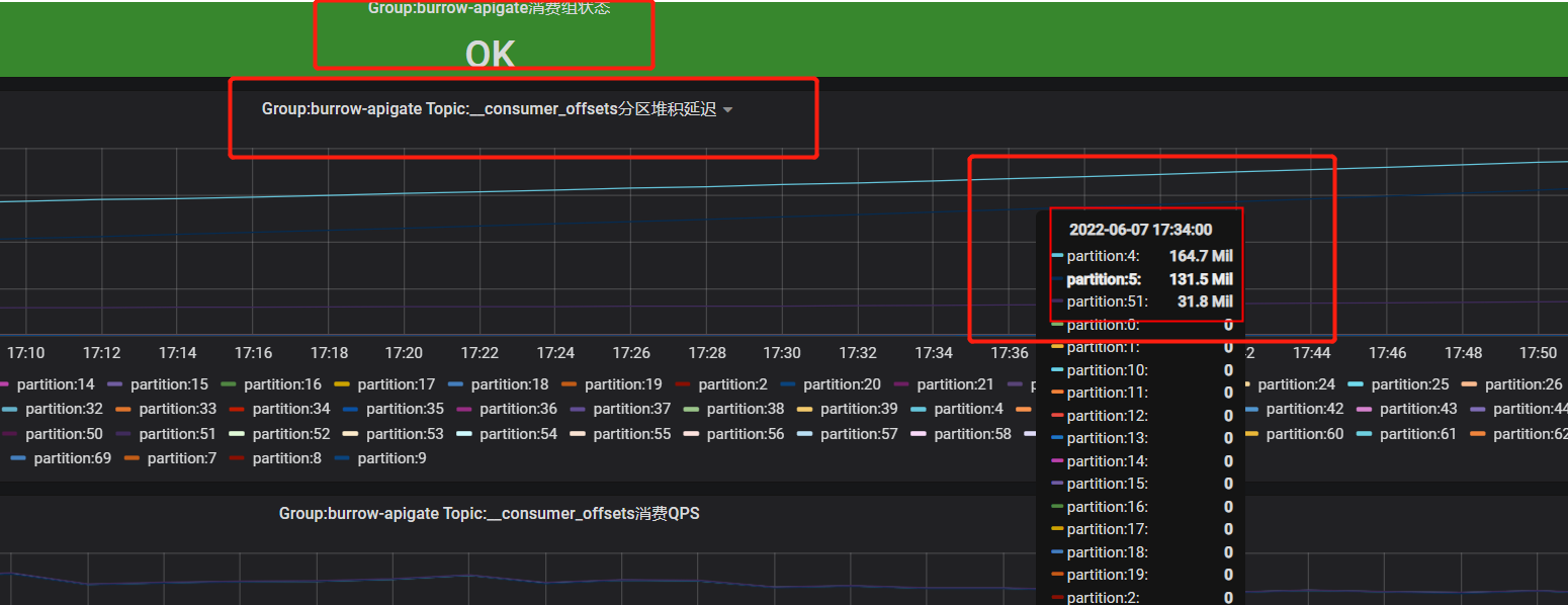 查看对应的消费组消费堆积延迟的监控,可以看到某几个Partition消费是延迟的。