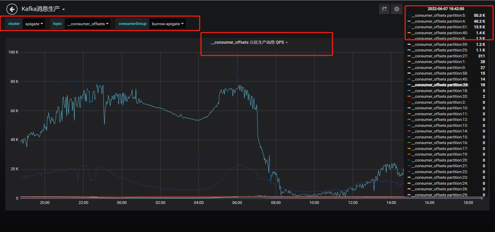 从监控中可知,该 __consumer_offsets topic对应的某几个Partition生产消息的QPS较高。