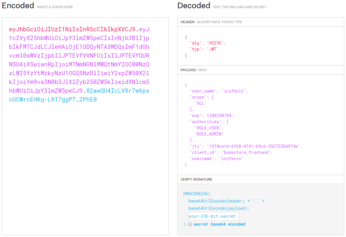 图 5-13 中右边的状态信息是对令牌使用 Base64URL 转码后得到的明文,请特别注意是明文,JWT 只解决防篡改的问题,并不解决防泄漏的问题,因此令牌默认是不加密的。