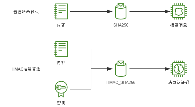HMAC 哈希与普通哈希算法的差别是普通的哈希算法通过 Hash 函数结果易变性保证了原有内容未被篡改,HMAC 不仅保证了内容未被篡改过,还保证了该哈希确实是由密钥的持有人所生成的。如下图所示。