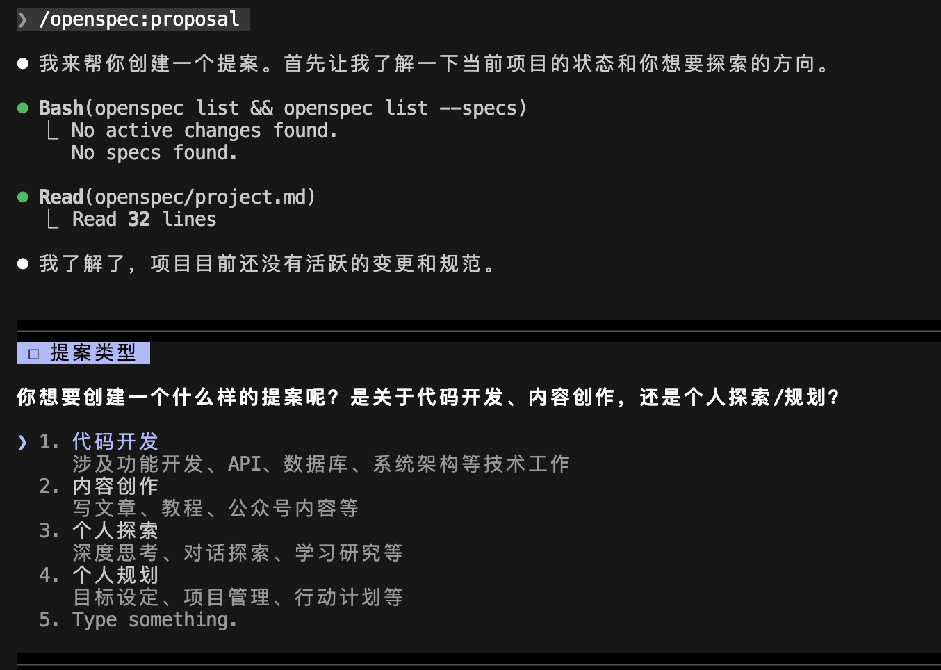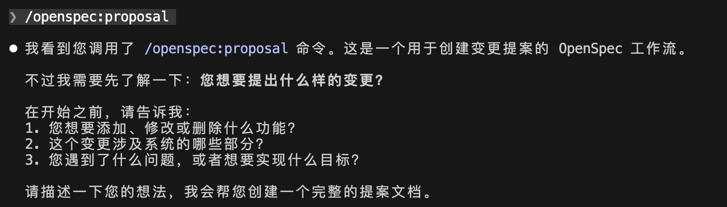 改造后,原本我们发起 OpenSpec 提案,AI 给的回复是: