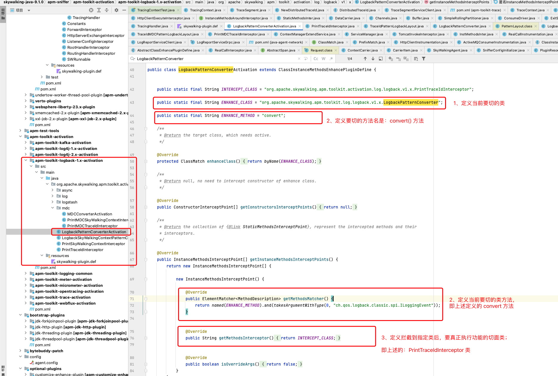 在 Agent 中定义一个 logback 的插件,直接切当前 LogbackPatternConverter 类的 convert()方法,进行字节码增强。