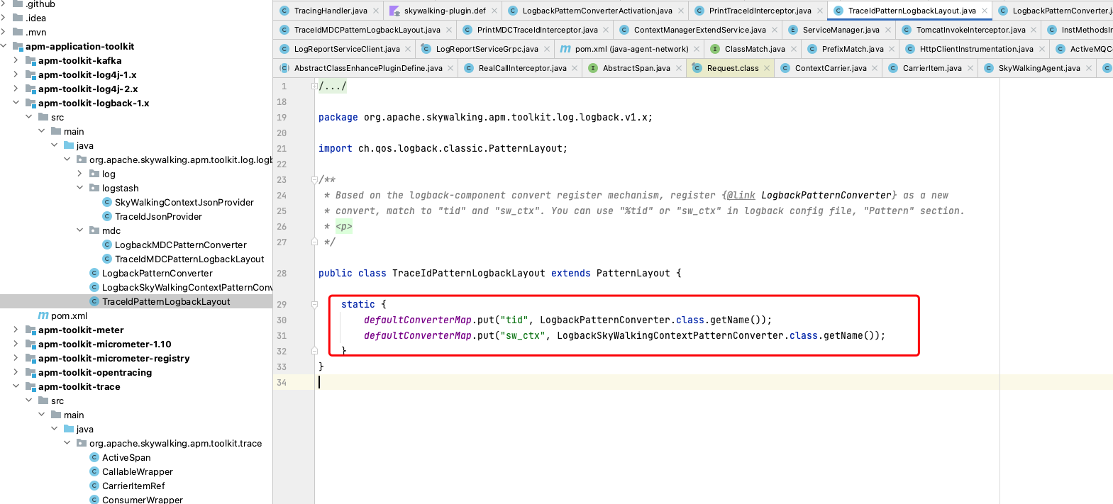 我们在对应的 apm-toolkit-logback-1.x 的项目中,除了定义了tid 的 convert 转换外,还有对应的 sw_ctx 这个字段。所以如果需要获取对应的 sw 上下文(spanid,serviceName,instanceName)等信息。