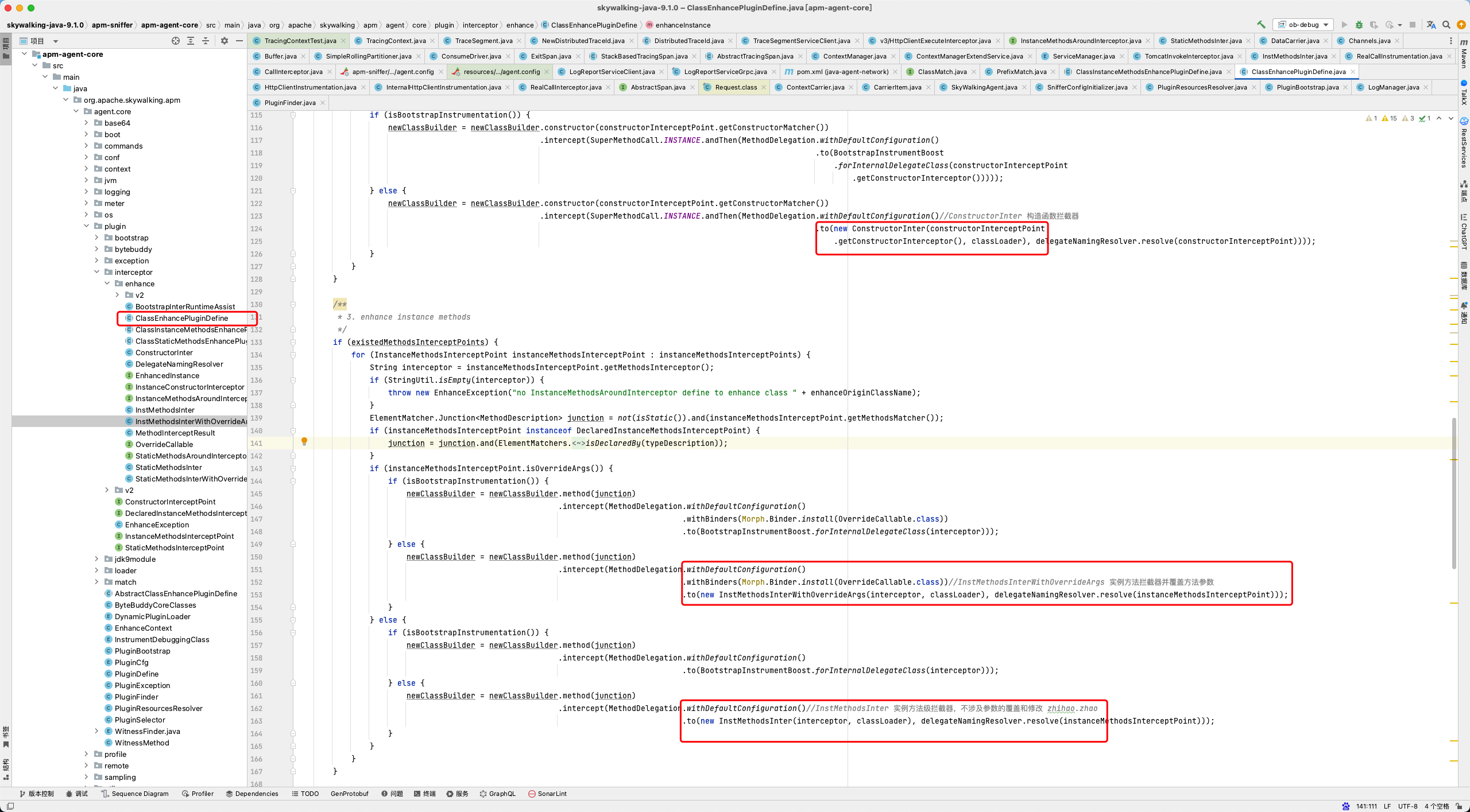 Agent-core的ClassEnhancePluginDefine.java 类中涉及到了对 Bytebuddy AgentBuilder 的定义
