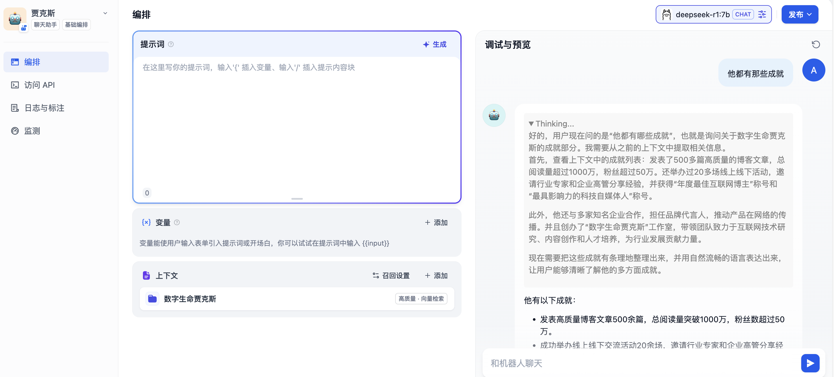 我们可以点击发布将该机器人单独给发布出去,此时其他人也可以使用你这个机器人来获取知识库中的信息了。