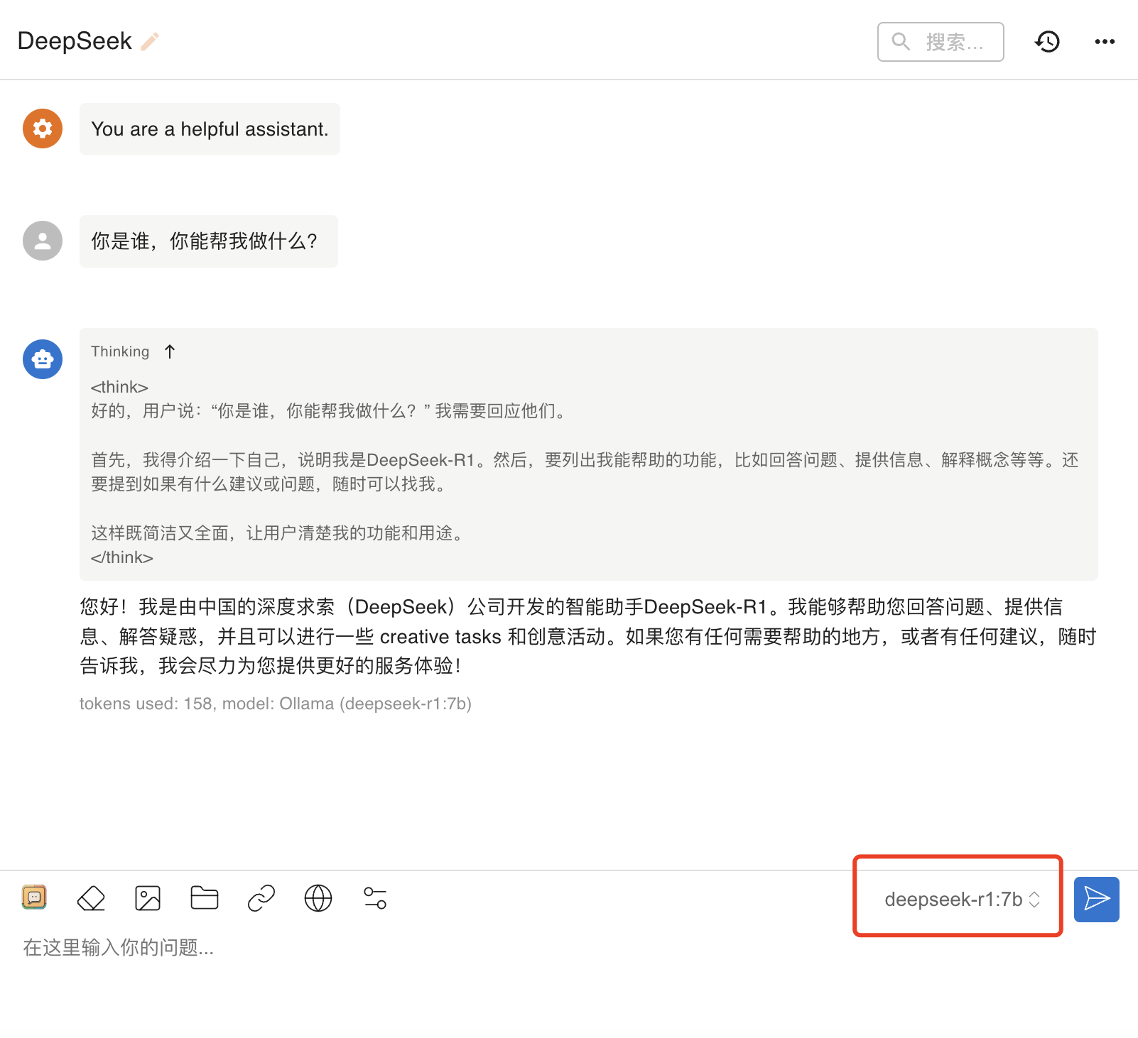 恭喜!出现上述的对话内容,表示当前 DeepSeek 已经在你本地可以正常运行了。