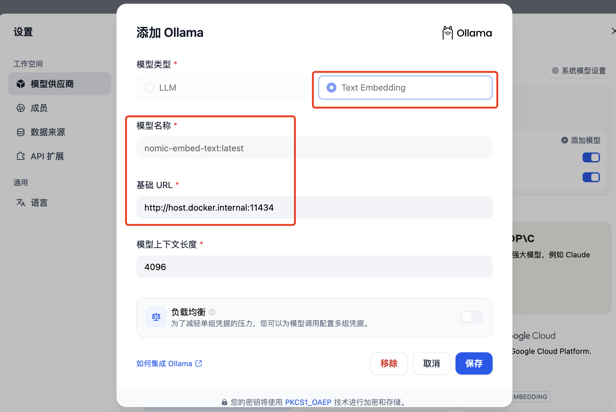 添加完 LLM 模型后,我们再新增一个Text Embedding 模型,还记得最开始我们使用 ollama 还安装了一套nomic-embed-text模型吗?对的,就是在这里使用的。