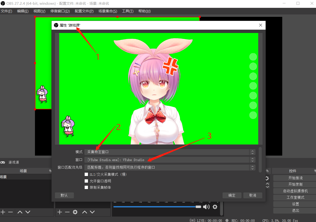 此时我们新建一个来源,并选择游戏源,在模式中选择“采集特定窗口”,在对应的窗口选择中选择我们已经打开的应用进程“VTube Studio”,选择完点击确认即可。