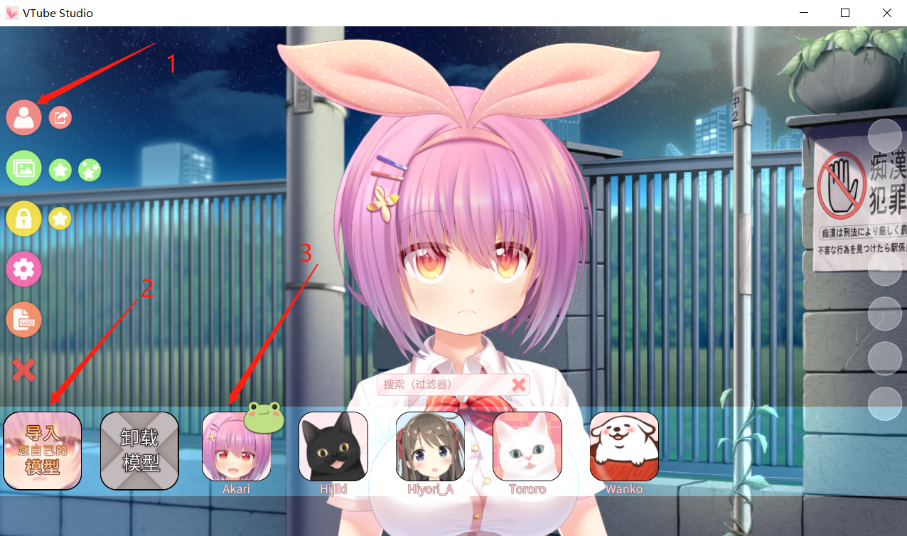 然后开始选择你要使用的模型,可以选择导入模型(前提是你需要先制作一款模型,我们现在常见的AI换脸的模型,差不多就是这样搞的),这里我们直接选择一款已有模型Akari,做一下人脸跟踪验证先。