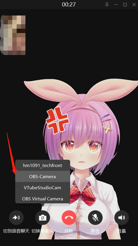 使用电脑开启微信视频验证下,此时我们在微信视频对应的摄像头中,选择“OBS-Camera”,然后微信视频便实时接入虚拟摄像头啦,是不是贼简单